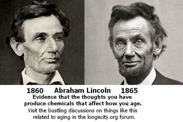 I saw this picture on a site when I did a search about the effects of stress on aging. This stunning photo shows President Abraham Lincoln in the short 5-year span of his Presidency during the Civil War. I am not sure that we can attribute all of this dramatic change to stress alone. Many believe that Lincoln suffered from a hormonal imbalance caused by a pituitary problem. I do not know that for sure of course, however, this picture shows a man under tremendous stress.