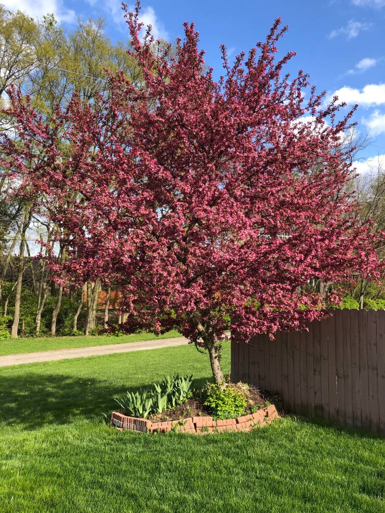 This is a picture of the “Maggie Tree”. This time of year, it blossoms and it reminds me of our dear Maggie, our pet mixed breed (OK, mutt) dog whom we cared for and loved from 1988- 2005. She is buried under this tree. In fact, when I buried her, I planted the tree right on top of her. In this way, her body was the basis of the nutrients of this growing tree. It gives me some comfort to know that she still “lives” in this tree. Literally the molecules that comprised her are now living in this tree.